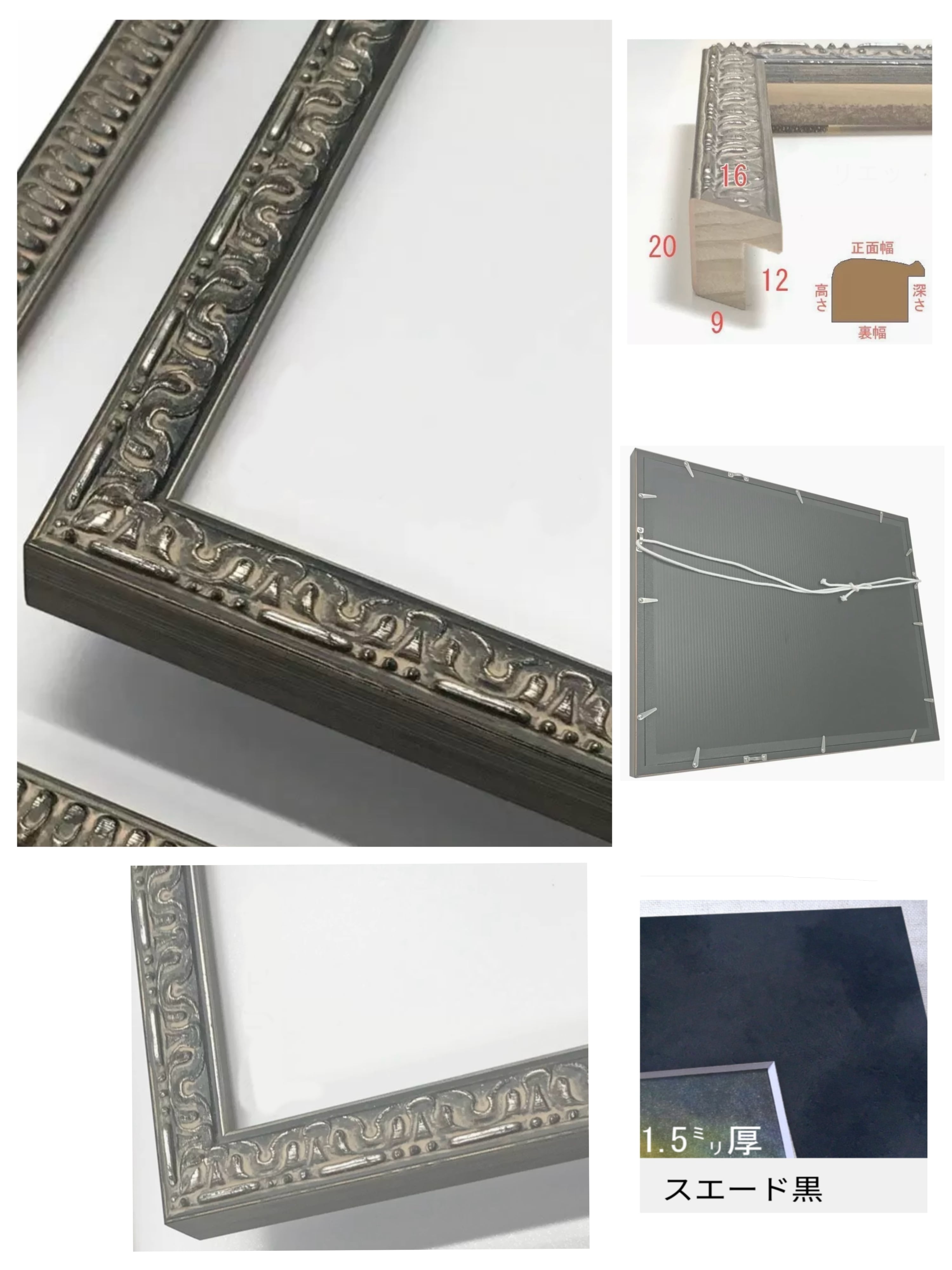 アンティークな雰囲気が強く漂う、黒塗りに銀箔を重ねた額縁。
